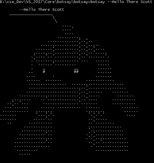 static void ShowBot(string message) { string bot = $"\n {message}"; bot += @" __________________ \ \ .... ....' .... .......... .............'..'.. ................'..'..... .......'..........'..'..'.... ........'..........'..'..'..... .'....'..'..........'..'.......'. .'..................'... ...... . ......'......... ..... . _ __ ...... .. # ## ...... .... . ....... ...... ....... ............ ................ ...................... ........................'................ ......................'..'...... ....... .........................'..'..... ....... ........ ..'.............'..'.... .......... ..'..'... ...............'....... .......... ...'...... ...... .......... ...... ....... ........... ....... ........ ...... ....... '...'.'. '.'.'.' .... ....... .....'.. ..'..... .. .......... ..'........ ............ .............. ............. '.............. ...........'.. .'.'............ ............... .'.'............. .............'.. ..'..'........... ............... .'.............. ......... .............. ..... "; Console.WriteLine(bot); }It’s a simple core console app that takes a text phrase as input and shows the bot saying it.